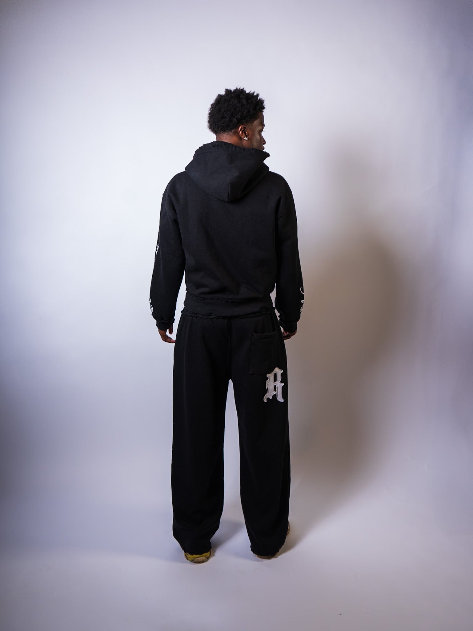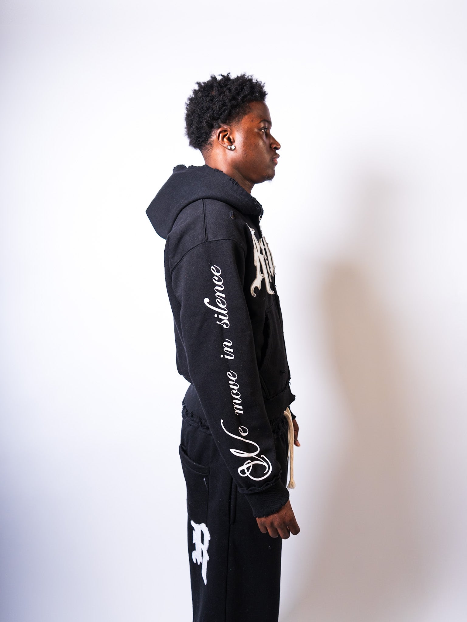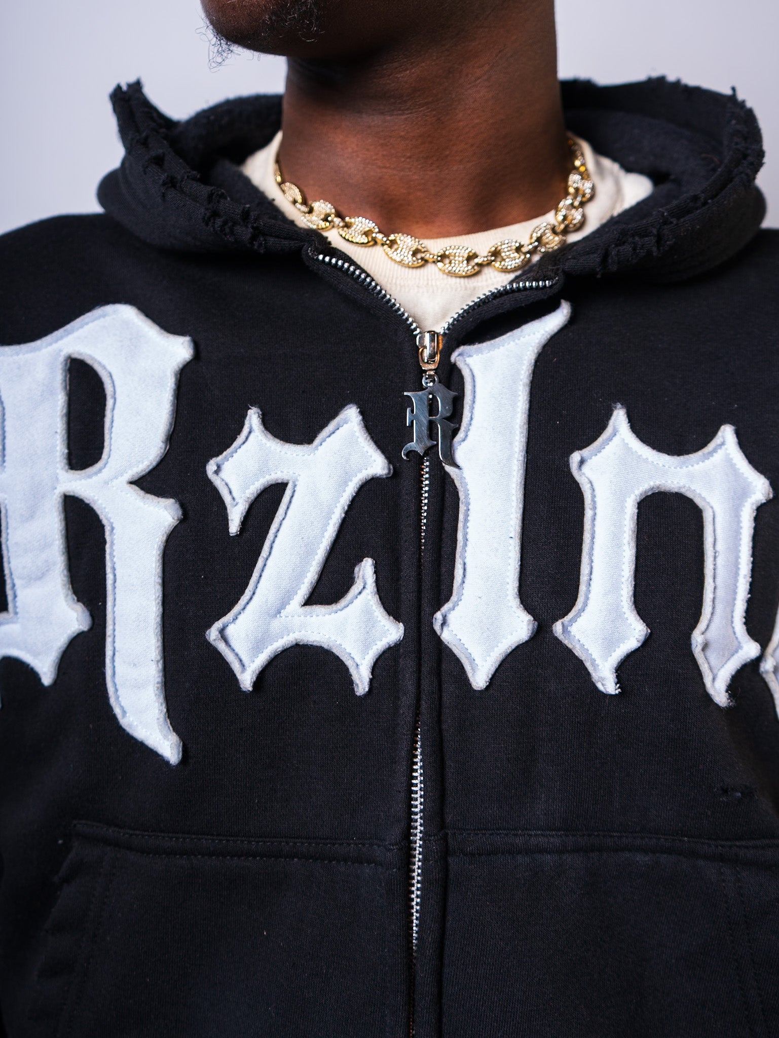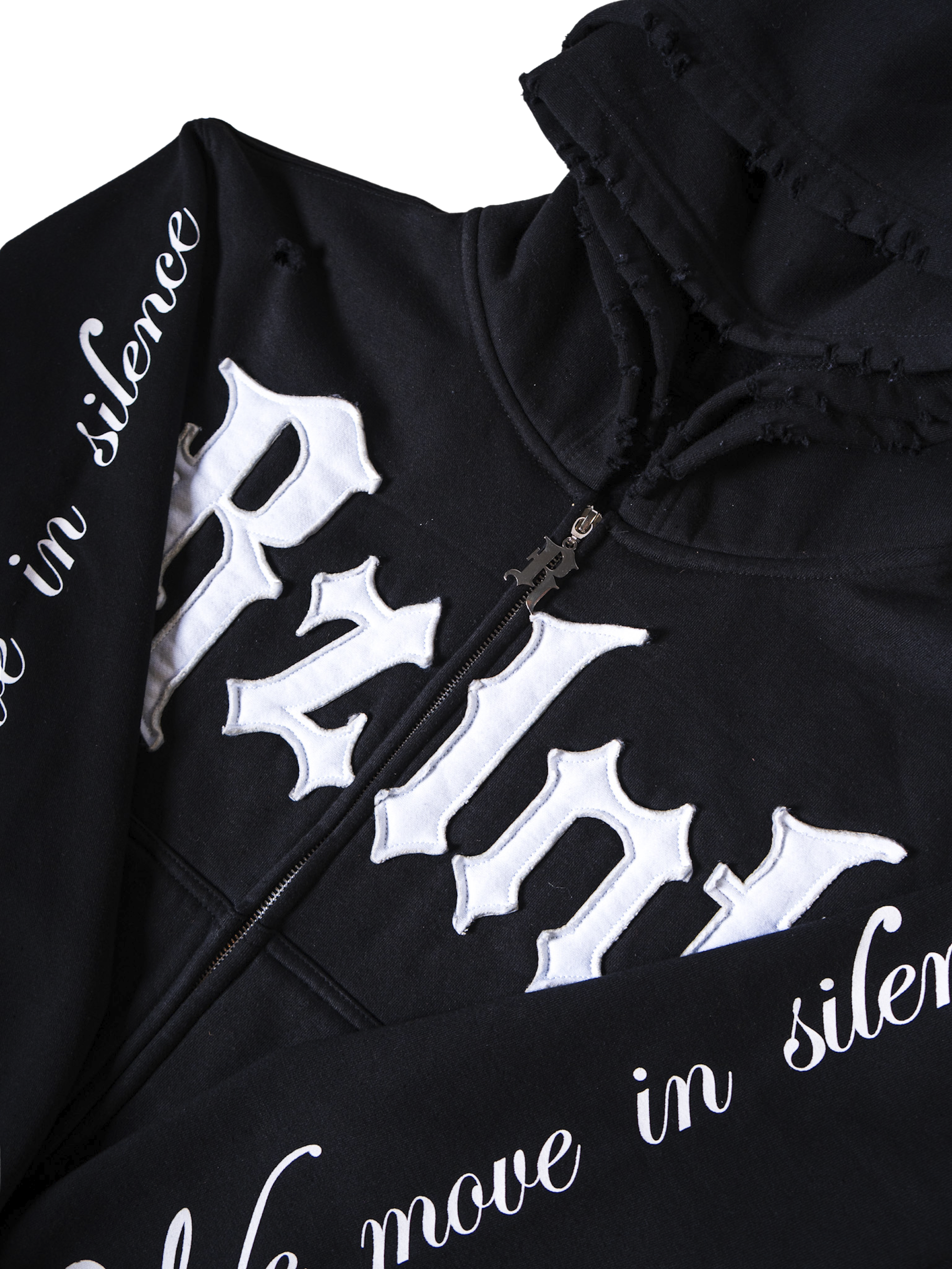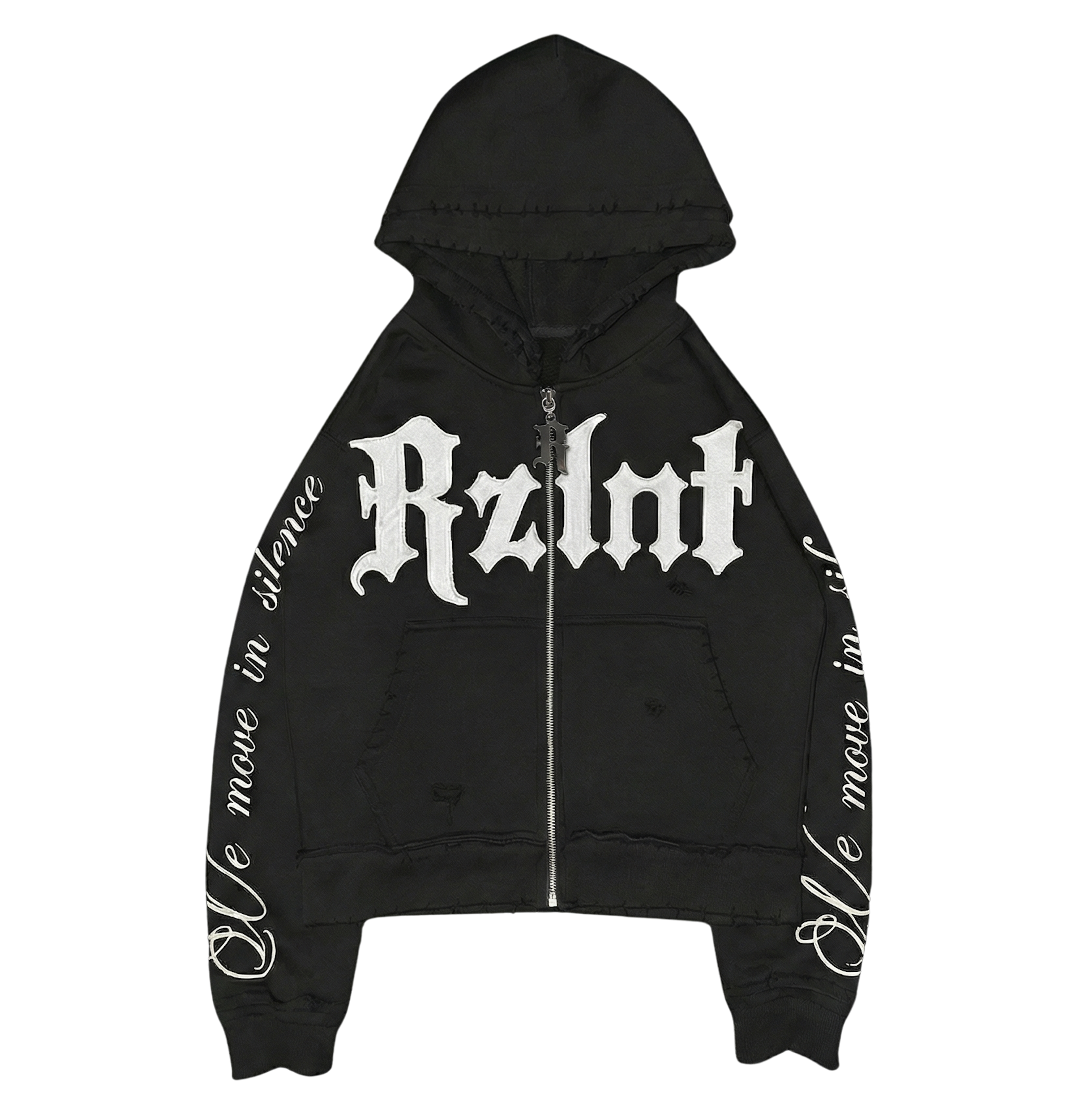 Details: Reverse stitch distressing. Custom metal zipper. Double hood for extra warmth